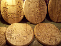 ball in that it is one of those days where there are no similar seats to carve and paint. I guess you just have to do it to know what I mean. Basically, all the seats and their color pallet are different and thus, I have to use every paint color at my disposal and wait for them to dry. It takes a long time to do fewer seats. This doesn't happen very often, but when it does, it means a late night for me. ( It's 6 am as I write this. And I still need to sleep!) Ah well, I'm off! I still have two more for tomorrow, And we are out of boxes! ( Yippee!) So only Mondays and one seat from tonight will be going out in the morning. ( err, afternoon, depending on how you look at it, Even I'm confused! Oh! And before I forget, I may have a project in the works for this weekend! Cheryl wants me to build a set of bookshelves. The fancy kind! I can't wait to take a crack at it.
